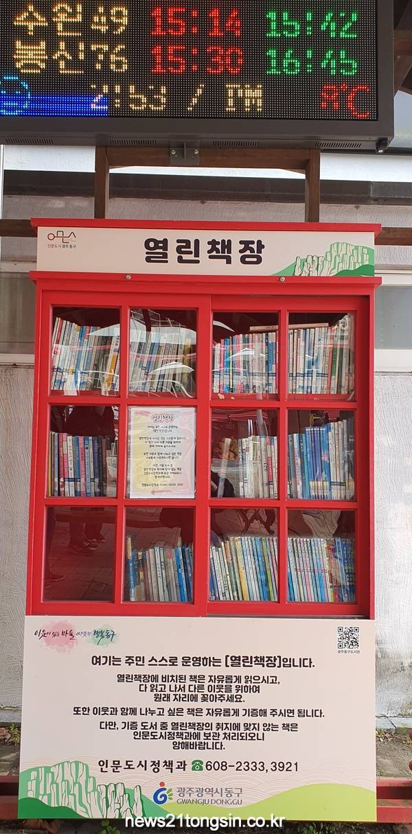 [뉴스21/장병기 기자] 광주 동구는 지난 10년간 증심사 회차지 버스정류장에 설치돼 무등산을 찾은 시민들에게 마음의 양식과 휴식을 제공하던 ‘열린 책장’을 새롭게 단장했다고 밝혔다.