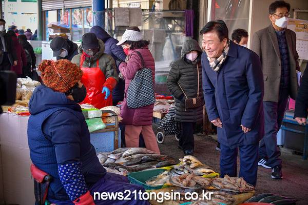 ▲ ▲ 정기명 시장이 전통시장을 찾아 상인들을 격려하고 있다.