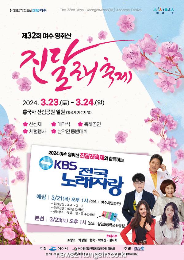 개막식은 오전 11시 흥국사 수변공원 특별무대에서 유명인의 축하공연과 함께 열리며, 시민과 관광객이 장기자랑을 뽐내는 ‘진달래 꽃맵시 선발대회’도 준비된다.
