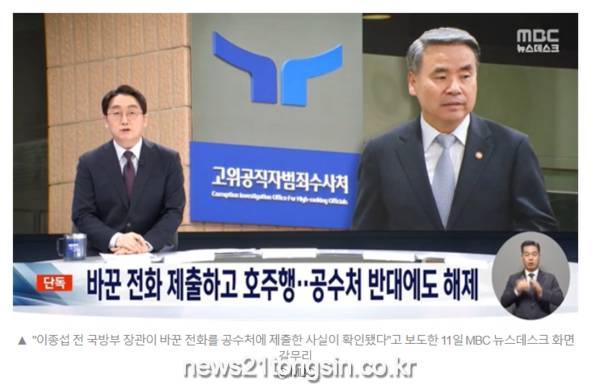 주호주대사로 임명된 이종섭 전 국방부 장관이 "수사에 협조하겠다"며 공수처에 제출한 휴대폰이 '채 상병 사건' 이후 처음 쓰기 시작한 새 휴대전화였던 것으로 확인됐다고 지난 11일 MBC 뉴스데스크가 단독 보도했다.
