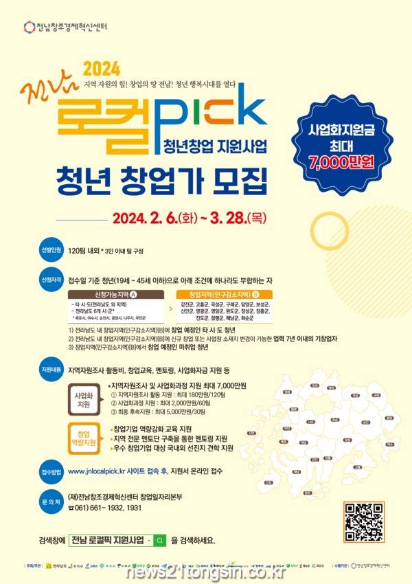 [뉴스21통신 박찬웅기자] 전라남도는 지역 자원을 활용한 청년창업을 지원해 일자리를 창출하고 지역에 활력을 불어넣기 위해 ‘2024년 전남 로컬픽(Local Pick) 청년창업 지원사업’을 추진키로 하고, 오는 28일까지 참여자를 모집한다고 밝혔다.