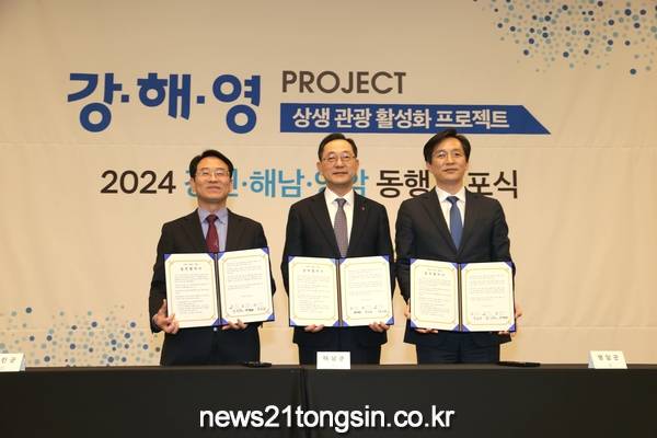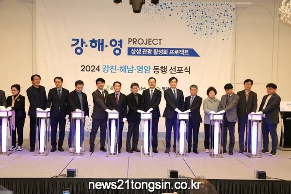 [뉴스21통신 박찬웅기자] 해남군과 강진군, 영암군이 관광콘텐츠를 한데 묶어 인구소멸에 대응하기 위한‘강해영 프로젝트’를 선보인다. 3개 군은 12일 서울시 용산구 나인트리 프리미어 로카우스 호텔에서 강해영(강진+해남+영암) 프로젝트 업무협약 및 동행선포식을 가졌다.