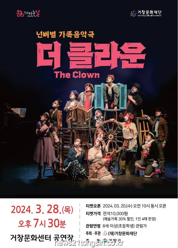 거창문화재단이 주관하는 2024문화가 있는 날 시리즈의 첫 번째 공연인 '넌버벌 가족음악극-더 클라운(The Clown)'공연이 오는 28일 오후 7시 30분 거창문화센터 공연장에서 개최된다고 전했다.