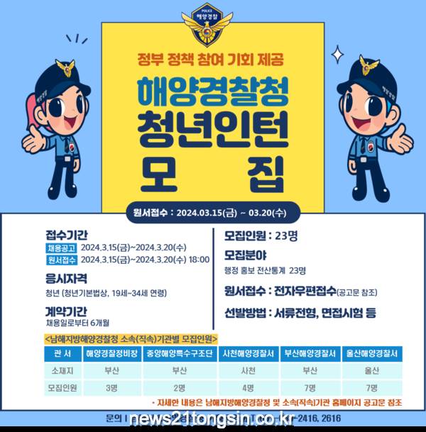 (뉴스21통신/우정석기자) = 울산해양경찰서(서장 정욱한)는 사회 진출을 준비하는 청년들에게 다양한 직무 경험 기회를 제공하기 위해 이달 15일~20일 18시까지 청년인턴을 채용한다고 밝혔다.