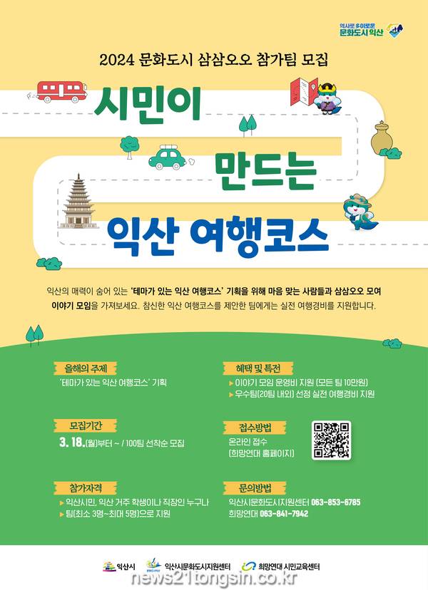 18일 시에 따르면 익산시문화도시지원센터는 희망연대와 함께 '2024 문화도시 삼삼오오'사업에 참여해 익산 여행코스를 기획할 시민 100팀을 모집한다.