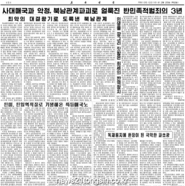 북한 노동당 기관지인 노동신문인 25일 박근혜 대통령의 취임 후 3년간 국정수행을 비난하는 기사를 한 면 전체에 걸쳐 실었다.