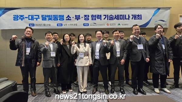 ▲ 달빛동맹 소부장 협력 기술세미나[뉴스21통신/장병기 기자] 광주광역시 와 대구광역시는 한국자동차연구원(KATECH)과 공동으로 22일 전북 남원 스위트호텔에서 ‘광주-대구 달빛동맹 소‧부‧장 협력 기술세미나’를 개최했다.