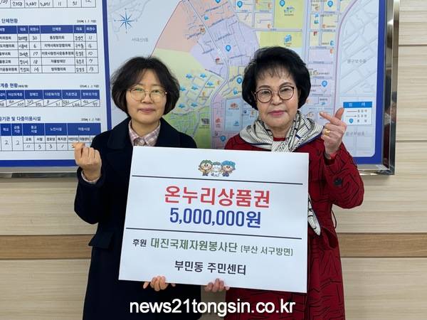 대진 국제자원봉사단 부산 서구 방면은 13일, 온누리 상품권(500만원)을 부민동 주민센터에 전달했다.