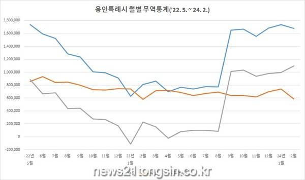 용인특례시 기업의 수출 실적은 반도체 불황으로 지난 2022년 6월부터 수출액이 점차 감소하기 시작해 한때 무역수지 적자를 기록하기도 했으나 지난해 9월부터 수출액과 무역수지가 큰 폭으로 상승하기 시작했다.