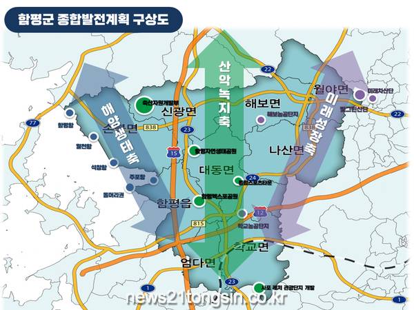 한편, 함평군 미래지역발전 비전사업은 함평을 세로로 나누어 서해바다와 연안을 해양생태축으로, 북쪽 산악지역과 함평천을 연결하는 중앙부를 산악녹지축으로, 광주와 인접한 동부권을 미래성장축으로 설정하고, 이 세 축을 따라 군 전체의 유기적인 발전을 도모하는 종합 발전 공간개발 계획이다.