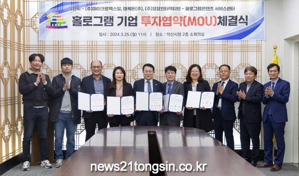 시는 25일 익산시청에서 ㈜마이크로엑스알(대표 표도연), 마케톤㈜(대표 양창준), ㈜요요인터렉티브(대표 이경주) 등 3개 홀로그램 기업과 투자협약을 체결했다.