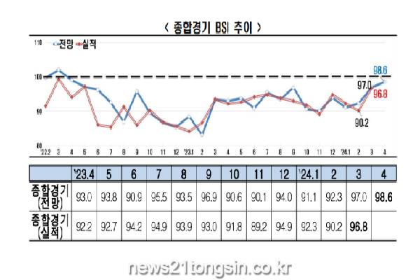 4월 BSI는 100보다 낮지만, 지난 2022년 5월 이후 2년 만에 가장 높은 수치다. 업종별로는 제조업이 98.4, 비제조업이 98.9로 각각 집계됐다.