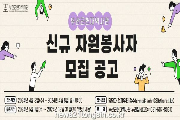 부산근현대역사관은 역사관을 이끌어 갈 신규 자원봉사자를 오는 4월 3일부터 8일까지 모집한다고 밝혔다.