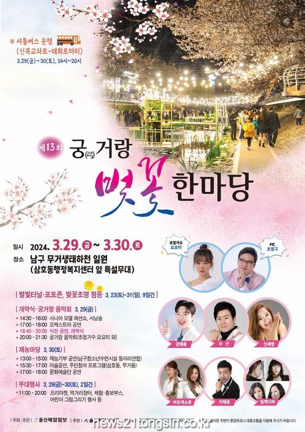 (뉴스21통신/최원영기자)=울산의 대표적인 벚꽃 축제인 '제13회 궁거랑 벚꽃 한마당' 축제가 오는 29일부터 30일까지 남구 무거천 일원에서 개최된다.