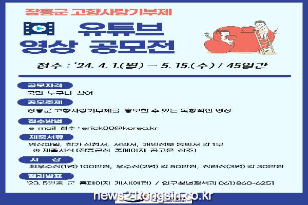 장흥군이 고향사랑기부제 홍보 및 활성화를 위해 유튜브 영상 공모전을 개최한다. 접수기간은 4월 1일부터 5월 15일까지며, 개인과 팀 모두 접수 가능하다.