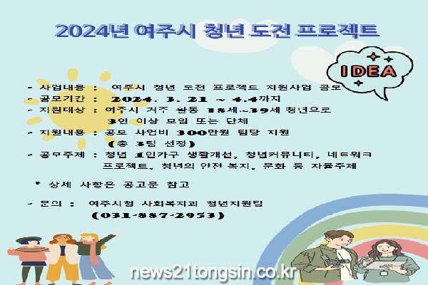 여주시는 청년층의 다양한 사회적 문제를 주제로 참신한 아이디어와 자율적인 프로젝트를 지원하기 위해 24년 신규사업인 여주시 청년 도전프로젝트를 추진한다고 밝혔다.