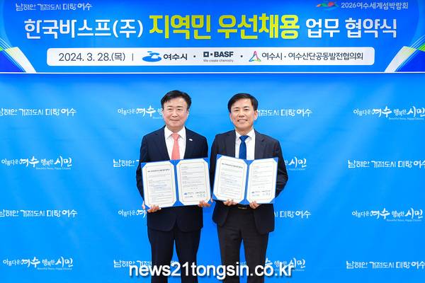 시에 따르면 지난 28일 오후 시장실에서 여수시와 한국바스프(주)가 ‘여수산단 지역민 우선채용’ 협약을 체결했다.