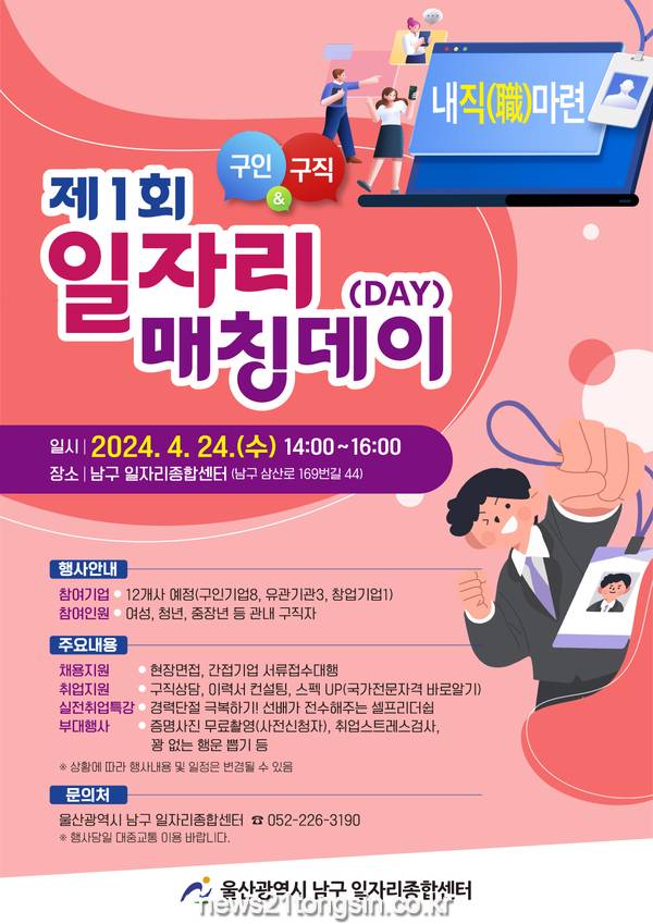 (뉴스21통신/최원영기자)=울산 남구(구청장 서도욱)는 오는 24일 남구 일자리종합센터에서 구인기업의 채용 시기에 맞춘 현장면접과 실전취업특강 등 다양한 취업지원 콘텐츠를 운영하는 ‘제1회 일자리 매칭데이’를 개최한다고 밝혔다.