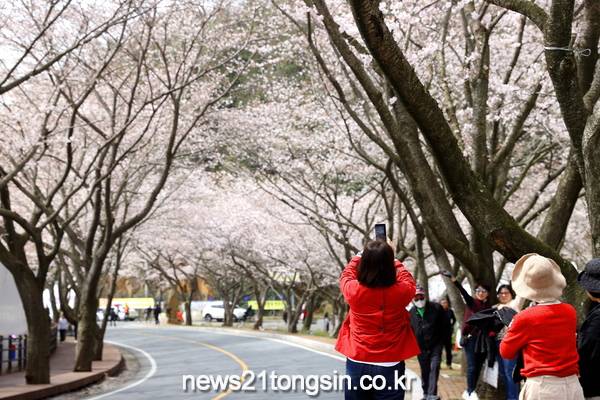 벚꽃길에 도착한 관광객들은 너도나도 휴대폰을 꺼내 벚꽃과 하나가 됐다.