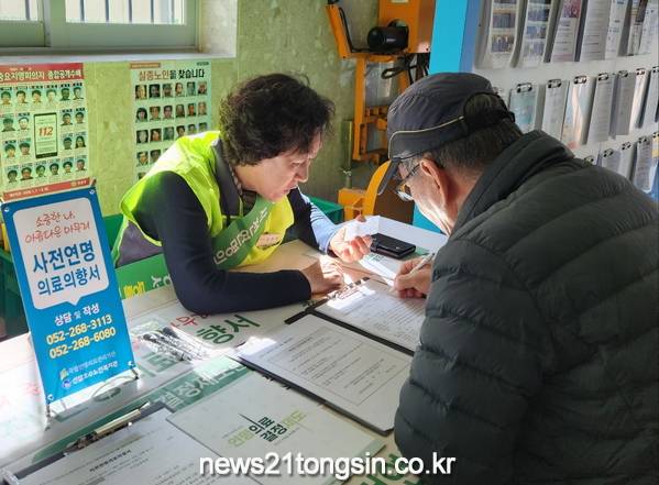 (뉴스21통신/최원영기자)=울산 남구(구청장 서동욱)는 전문성과 생애경력을 갖춘 어르신이 직접 삶의 존엄한 마무리를 도와드리는 역할을 하는 사회서비스형 노인일자리인 ‘사전연명의료의향서 상담사 운영지원’ 사업을 효율적으로 추진하고 있다고 2일밝혔다.
