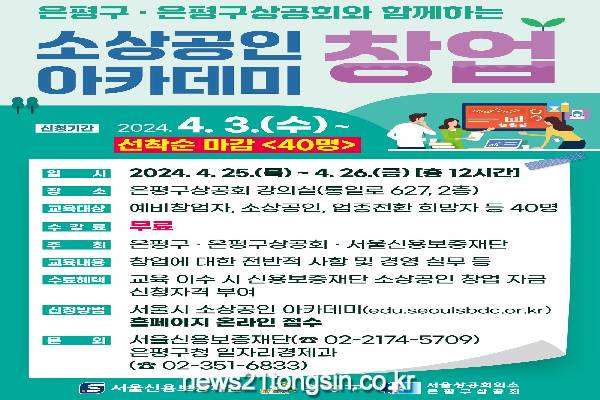은평구는 소상공인의 성공 창업을 지원하기 위한 '2024년 은평구 소상공인 창업아카데미' 교육생 40명을 모집한다고 밝혔다.