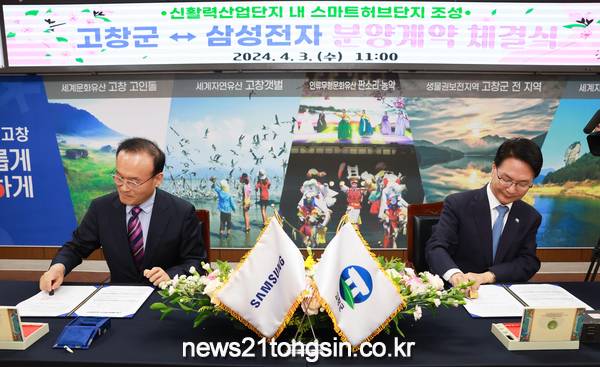 고창군이 지난 3일 군청 회의실에서 삼성전자㈜와 ‘스마트허브단지(삼성전자 호남권 물류거점 가칭) 조성사업 분양계약’을 체결했다.