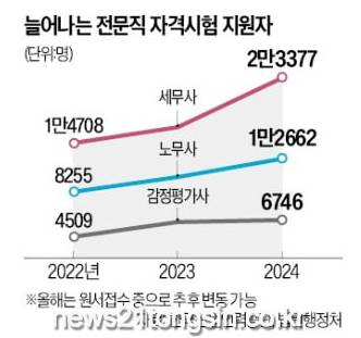 세무사 시험의 1차 접수자 수는 이날 기준 2만3377명으로 작년보다 39.0% 증가했다. 2021년 1만2494명, 2022년 1만4708명, 2023년 1만6816명으로 1만 명대를 유지하다가 처음 2만 명대로 올라섰다.