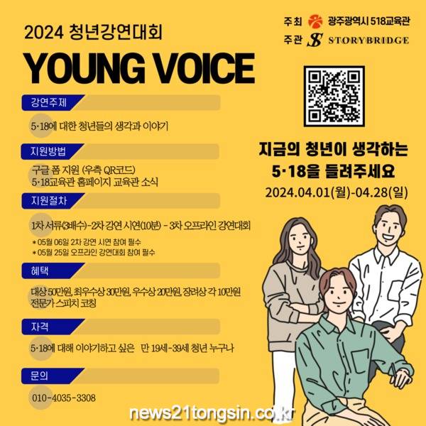 광주광역시는 5·18에 대한 청년들의 자유로운 생각과 이야기를 듣기 위해 오는 5월 25일 5·18교육관에서 ‘5·18 청년강연대회’를 개최한다.