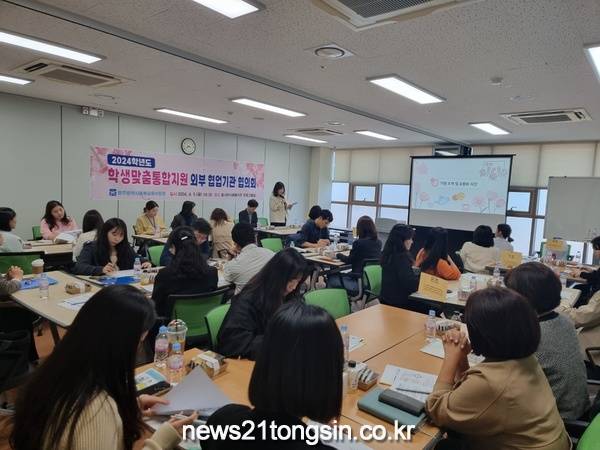 광주동부교육지원청이 지난 5일 꿈나무사회복지관에서 동구, 북구지역 지자체, 민간기관 사례관리 담당자 35명 대상으로 학생맞춤통합지원사업 운영을 위한 외부 협업기관 협의회를 개최했다. 학생맞춤통합지원은 복합적인 어려움을 가진 위기 학생을 조기 발굴해 통합 지원하는 사업이다.
