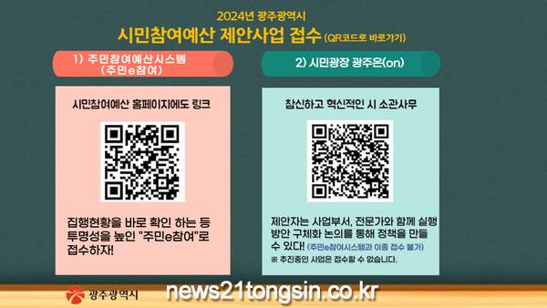 ▲ 일_이미지_시민참여예산 정보무늬광주광역시는 내년도 예산 편성을 위한 시민참여예산 제안사업을 5월 10일까지 공모한다. 시민참여예산은 예산 과정에 시민 참여를 보장해 재정 운영의 투명성을 높여 재정민주주의를 강화하는 제도다.