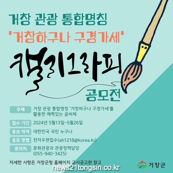 거창군은 거창 관광 통합명칭 ‘거창하구나 구경가세’를 활용한 매력있는 글씨체를 개발하고자 `거창 관광 통합명칭 캘리그래피 공모전`을 개최한다고 8일 밝혔다.