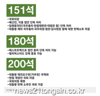 헌법 개정안을 국회에서 의결할 수 있고, 국회의원 제명도 가능하다. 대통령 탄핵 소추를 처리하는 것도 재적의원 3분의 2, 200석으로 가능하다.