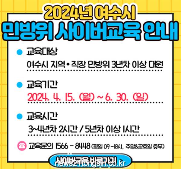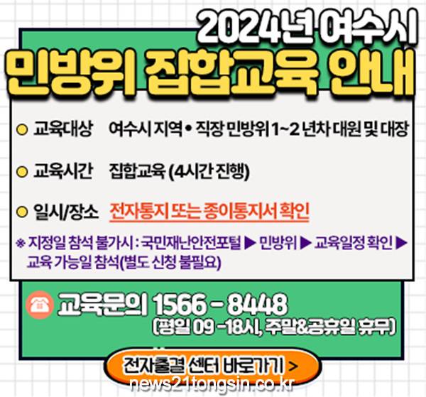 민방위대원의 각 지자체별 교육일정은 국민재난안전포털(www.safekorea.go.kr)에서 확인하거나 여수시 안전총괄과(☎061-659-3141) 또는 거주지 주민센터로 문의하면 안내받을 수 있다.