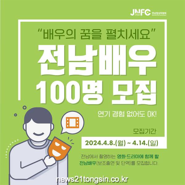 [뉴스21통신 박찬웅 기자] 전라남도는 (사)전남영상위원회(이사장 김영록·운영위원장 최수종)가 전남도민을 대상으로 ‘전남배우’ 100명을 오는 14일까지 모집한다고 밝혔다.