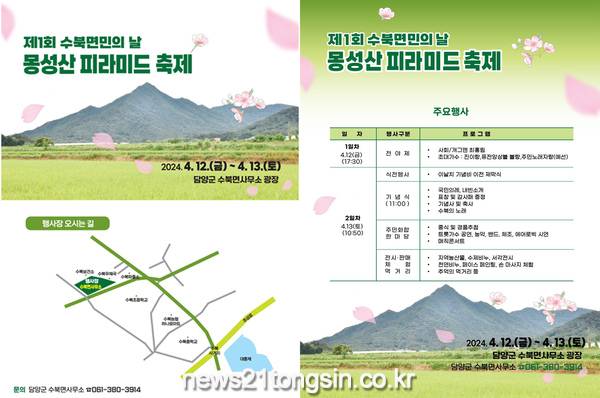 담양군 수북면이 제1회 면민의 날을 맞아 4월 12일부터 13일까지 이틀간 담양군 수북면사무소 광장 일원에서 ‘몽성산 피라미드 축제’를 개최한다.
