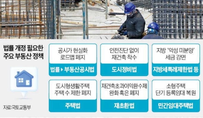 국토부는 ‘1·10 대책’을 통해 지방의 준공 후 미분양 주택 구입 때 1가구 1주택 특례를 적용하고, 임대주택으로 활용하면 원시취득세를 감면해주겠다는 방안을 내놨다. 하지만 각각 조세특례제한법과 지방세특례제한법 개정이 필요한 과제다. 도시형생활주택 가구 수 제한 폐지(주택법 개정), 신탁 방식 정비사업 의사결정 간소화(도시정비법 개정) 등도 정부 의지만으론 할 수 없다.