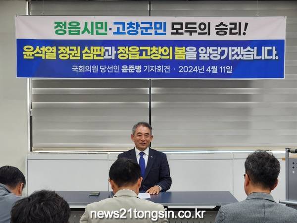 제22대 총선에서 86.86%의 압도적인 득표율로 제22대 정읍고창 국회의원에 당선된 윤준병 국회의원(더불어민주당, 제21대 국회의원)이 오늘(11일), 정읍시청 브리핑룸에서 기자회견을 갖고“이번 총선 승리는 국민의 승리이자 정읍시민·고창군민의 승리”라고 강조했다.
