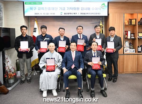 (뉴스21통신/권혁진기자) = 울산 북구교육진흥재단은 12일 북구청장실에서 2023년 재단에 장학금을 기탁한 기부자에게 감사패를 전달했다.