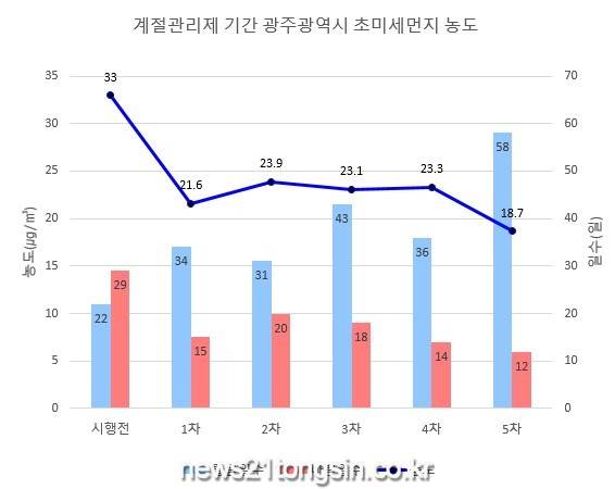 제5차 계절관리제 기간 초미세먼지 평균농도는 18.7㎍/㎥으로 계절관리제 시행 전 같은 기간(2018년 12월~2019년 3월) 평균농도(33㎍/㎥)보다 43.3% 개선됐다.