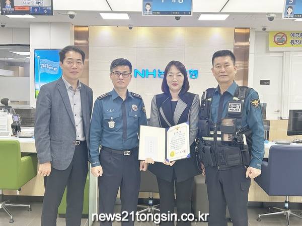 (뉴스21통신/최원영기자)=울산남부경찰서 무거지구대는 12일 NH농협은행 울산문수지점을 방문해 1천300만원 상당의 전화금융사기, 즉 보이스피싱 피해를 막은 은행원에게 울산시경찰청장 감사장과 신고포상금을 수여하였습니다.
