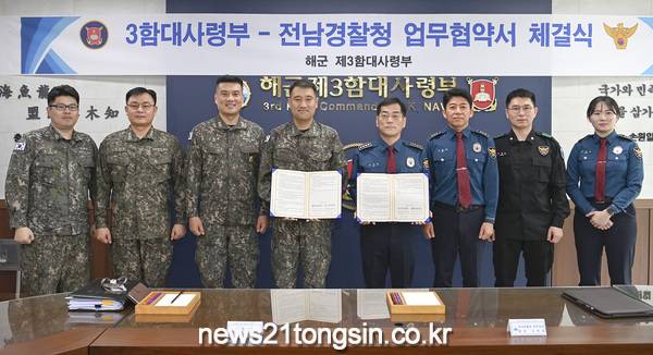 [뉴스21통신 박민창기자] 전라남도경찰청이 16일 오후, 해군 제3함대사령부(이하 3함대) 대회의실에서 3함대와 업무협약을 체결했다.