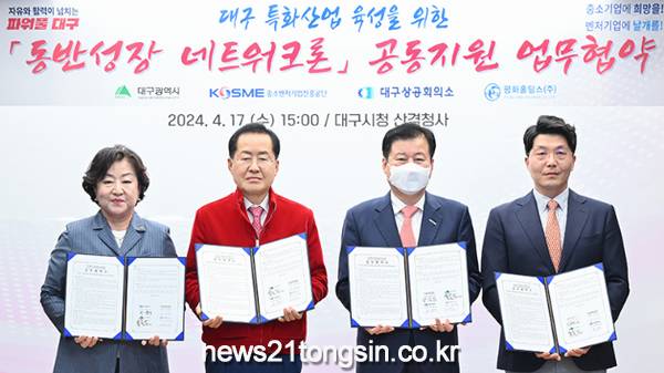 대구광역시와 중소벤처기업진흥공단(이하 중진공), 대구상공회의소 및 평화홀딩스(주)는 4월 17일(수) 오후 3시 대구광역시 산격청사에서 전국 최초로 ‘특화산업 육성을 위한 동반성장 네트워크론 공동지원 업무협약’을 체결했다.