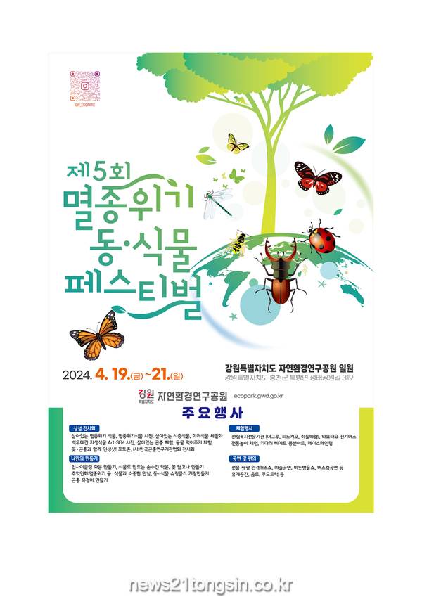 강원특별자치도 자연환경연구공원은「제5회 멸종위기 동․식물 페스티벌」을 4월 19일(금)부터 21일(일)까지 총 3일간 자연환경연구공원에서 개최한다고 밝혔다.