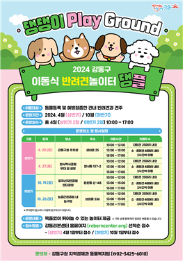 반려견과 주인이 함께 즐길 수 있는 찾아가는 반려견 놀이터 ‘댕플’은 20일(토)에는 강동구청 주차장에서, 27일(토)에는 암사역사공원 무대 앞 광장에서 오전 10시부터 오후 5시까지 열린다.