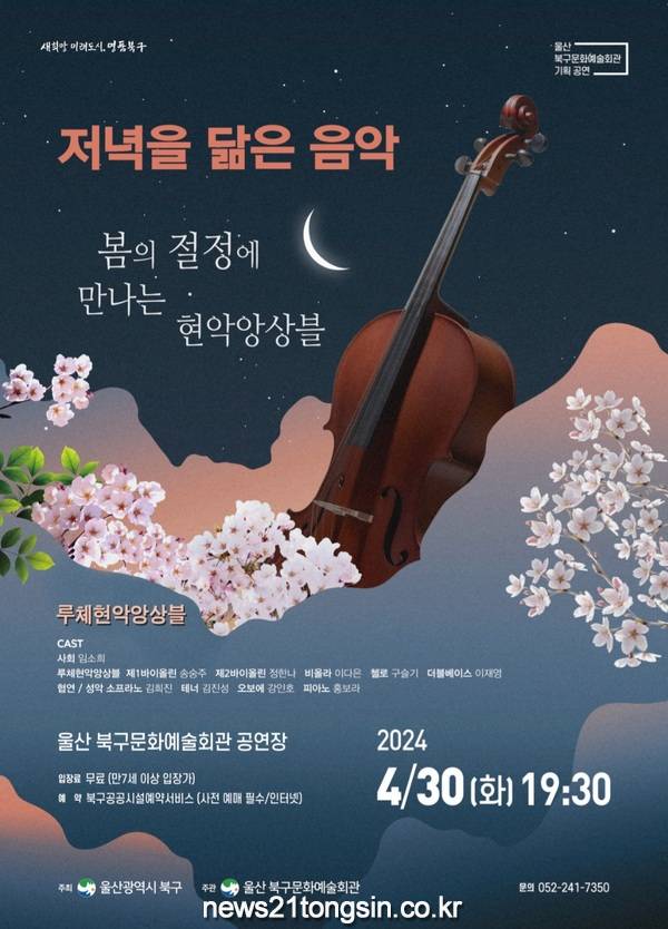(뉴스21통신/권혁진기자) = 울산 북구문화예술회관은 오는 30일 오후 730'저녁을 닮은 음악' 올해 첫 공연으로 루체현악앙상블의 무대를 마련한다.