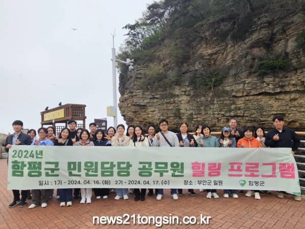[뉴스21통신 장두진기자] 전남 함평군은 지난 17일과 18일 이틀간 전북 부안군 일대에서 민원 업무담당 직원 70여 명을 대상으로 2024년 민원담당 공무원 힐링 프로그램을 운영했다.
