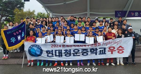 (뉴스21통신/우정석기자) = 울산시 동구 현대청운중학교(교장 이상규)가 ‘2024 춘계한국여자축구연맹전’ 중등부 4년 연속 우승을 차지하면서 전국 최강 여자 축구팀임을 다시 한번 입증했다.