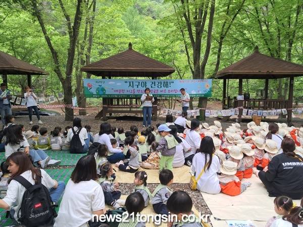 [전북=뉴스21] 오충일 기자=전북특별자치도 국공립어린이집연합회 완주지회가 고산자연휴양림에서 환경캠페인을 전개했다.