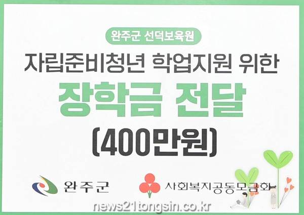 [전북=뉴스21] 오충일 기자= 완주군이 지난 19일, 자립준비청년 4명에게 학업지원을 위한 장학금 400만 원을 전달했다.