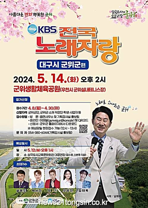 군위군은 5월14일 군위읍 군위생활체육공원에서 'KBS 전국노래자랑 군위군편'을 개최한다.